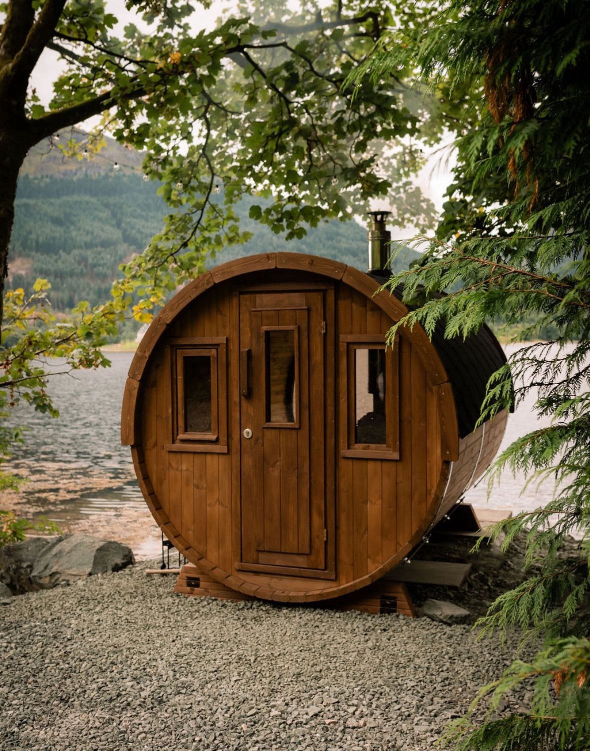 - A wood-fired barrel sauna set on the edge of Loch Long