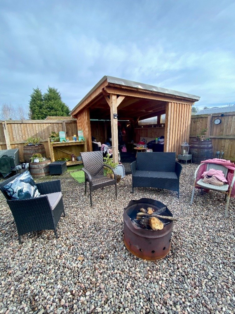 - Covered seating area with sofas and space to unwind